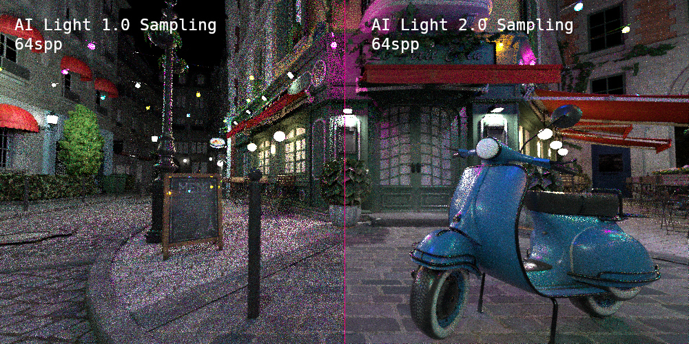 AI Light 2.0 – many light sampling is a hierarchical light-sampling algorithm that improves on Octane’s AI Light and traditional power-based sampling by incorporating full spatial and directional information for all emissive primitives, which allows sampling the emitters with the most contribution, delivering more accurate results with significantly reduced noise.