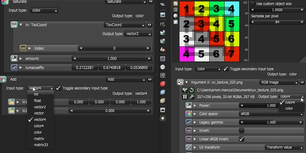Additional texture value nodes have been added for providing 4D vector and color values and for matrix values. Image texture nodes can now output RGBA colors with alpha channel (when applicable). Binary math operation texture nodes can now operate on selected value types with adaptive UX.