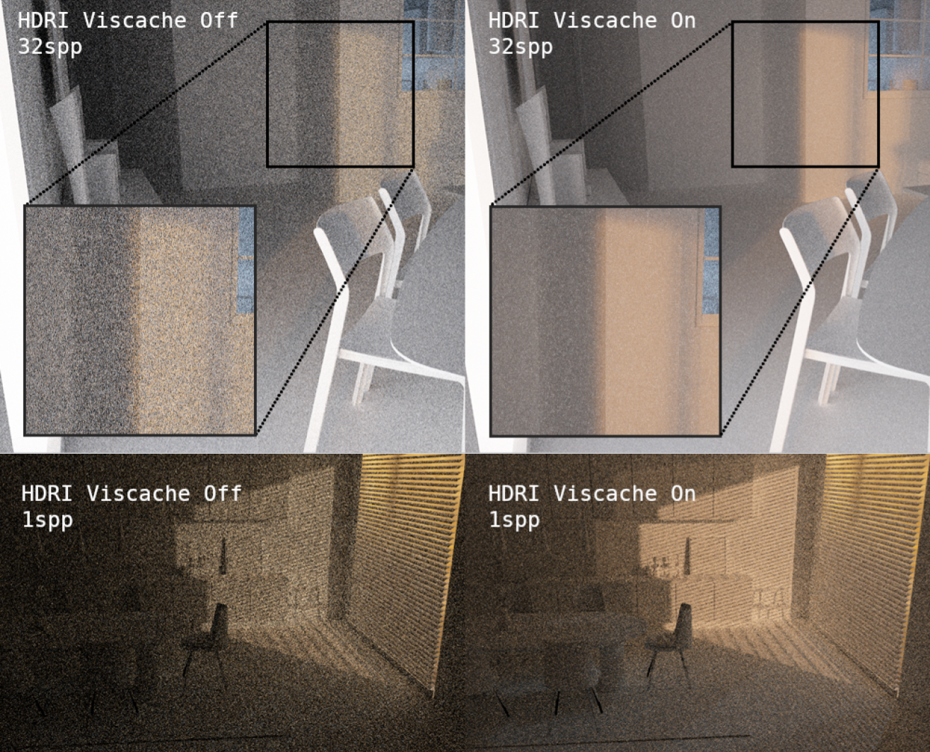 New support for Environment Map Visibility Caching improves HDRI environment sampling, enabling the generation of noise-free render results faster than previous implementations, especially under low light conditions. This is useful in a number of scenarios but specially suited to render indoor environments where most of the light contribution is provided by an external source.