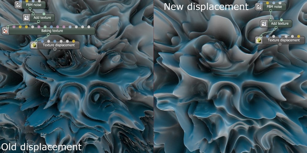 New high quality texture displacement reduces artifacts, requires less resolution and VRAM for the same detail as prior versions, and increases maximum displacement resolution to 16K, for ultra high resolution detail.