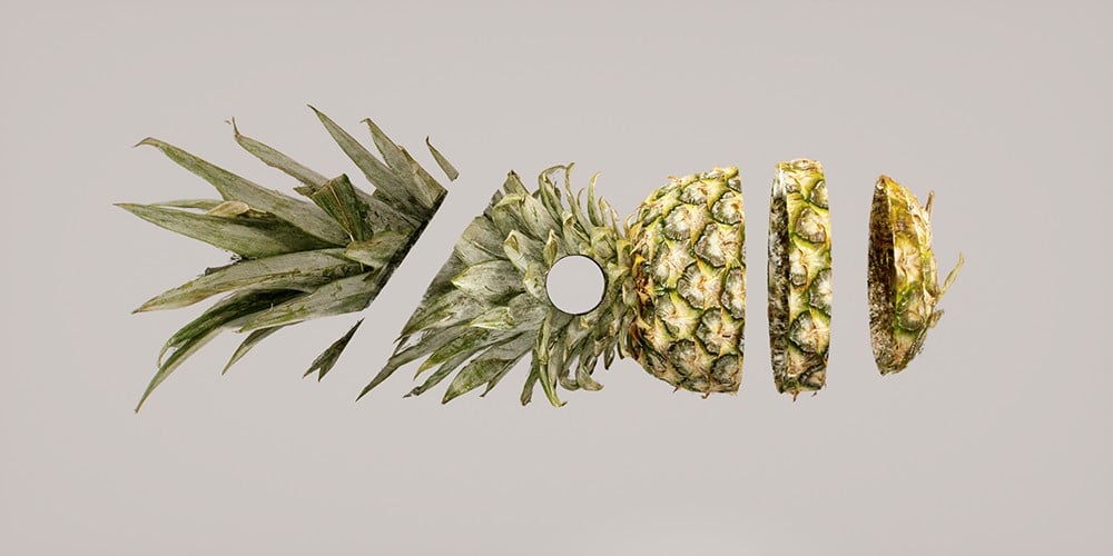 Pineapple Gaussian splat with 4 different clipping objects cutting holes and slicing it apart.