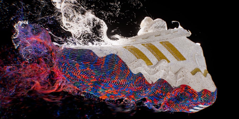 An athletic shoe Gaussian splat with a directional light creating a rim light effect and points driven by an advected particle simulation.